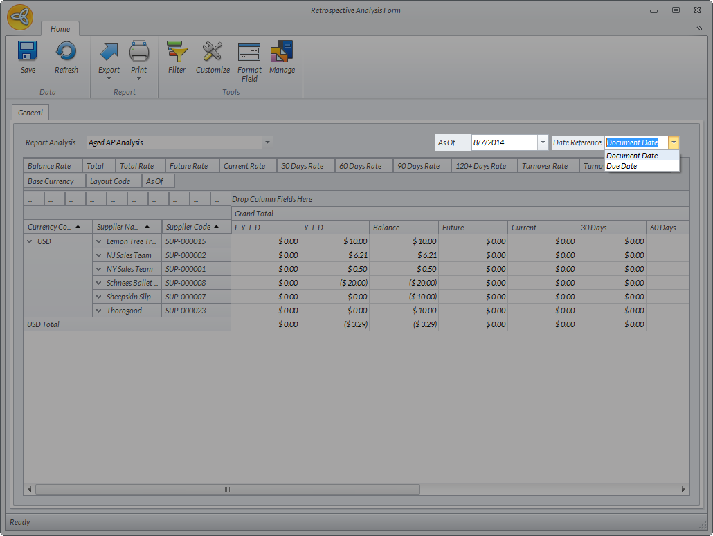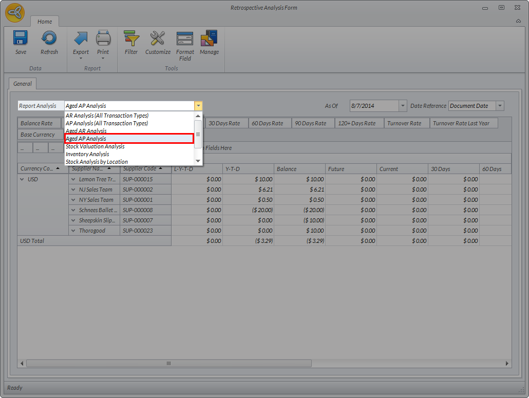 You can also view this report from the Retrospective Analysis form. Go to Accounting module > Retrospective Analysis. In the form, select Aged AP Analysis from the Report Analysis dropdown list.