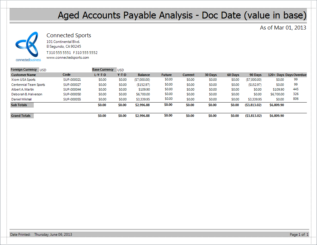 - Aged Accounts Payable Analysis – Doc Date (Value in Base) – This report shows the outstanding payables to suppliers which are converted to the home currency used by the business and based on the transaction date.