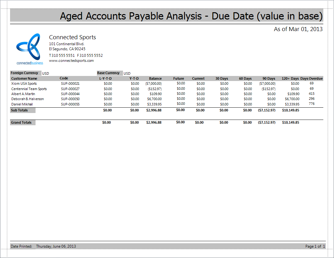 - Aged Accounts Payable Analysis – Due Date (Value in Base) – This report shows the outstanding payables to suppliers which are converted to the home currency used by the business and based on the due date the transaction.