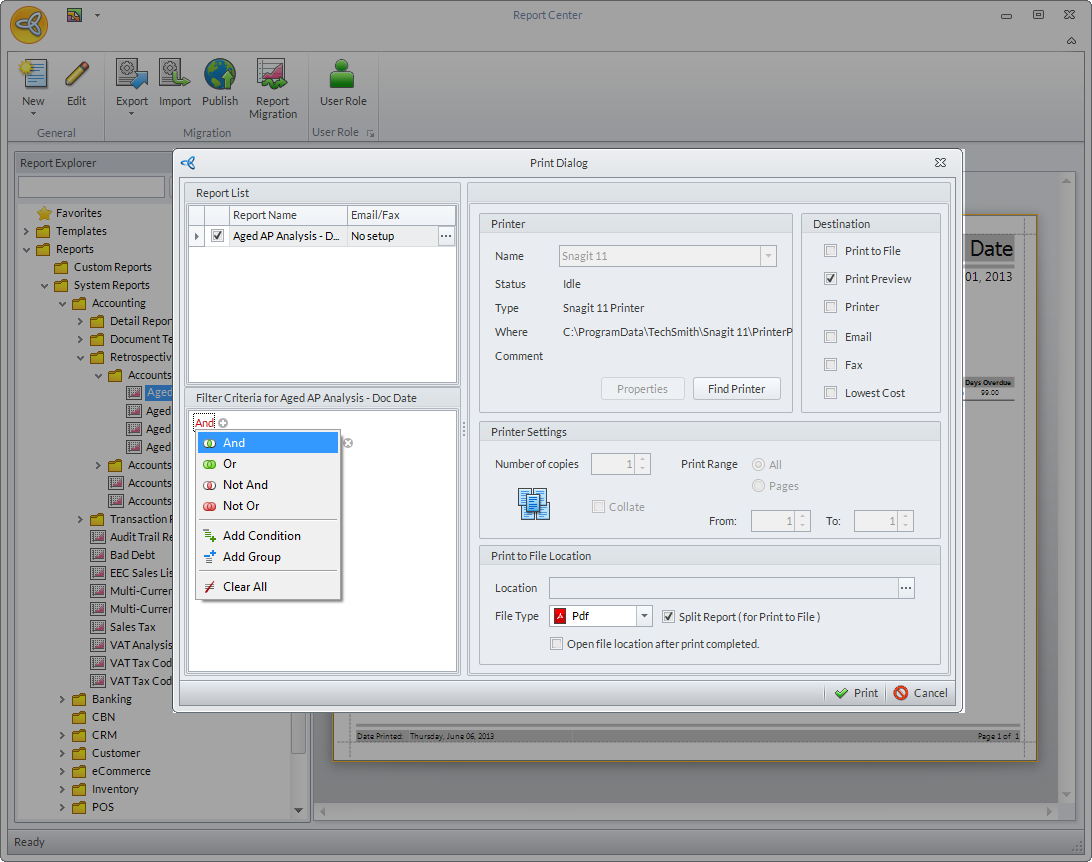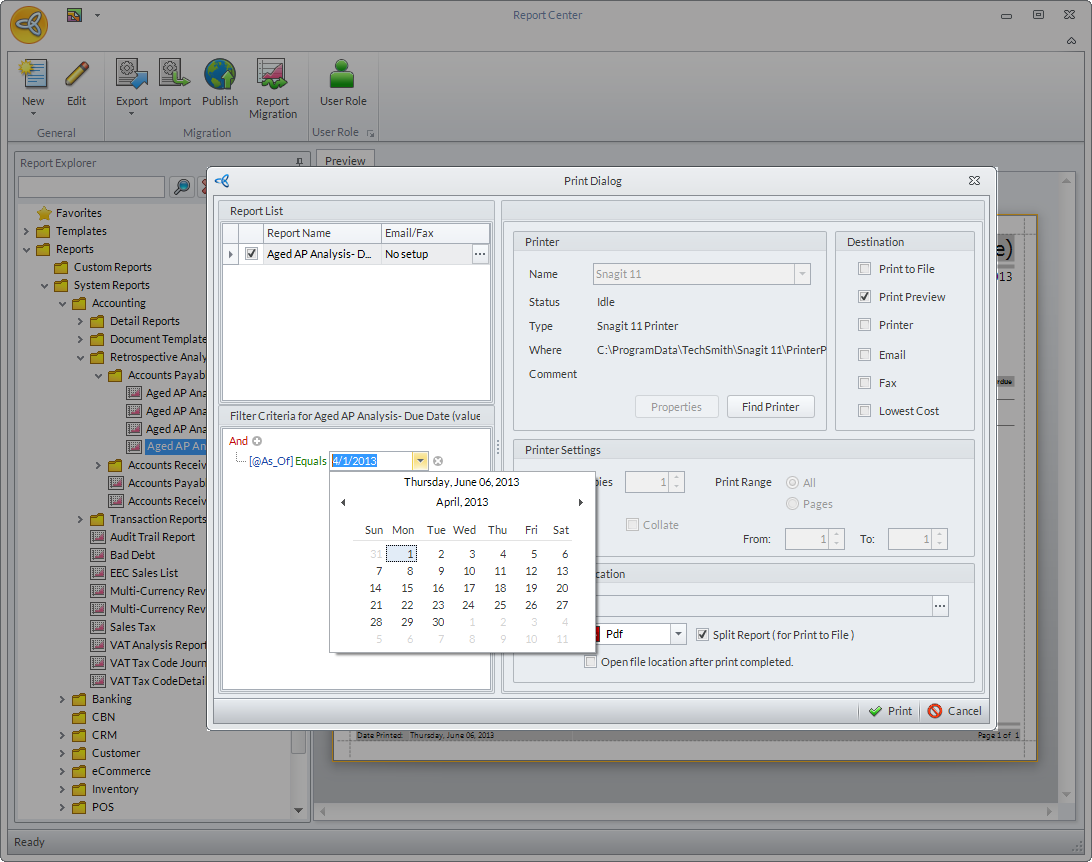 - Right-click on any report under Accounts Payable Aging and select Print Dialog. The Print Dialog form will be displayed.