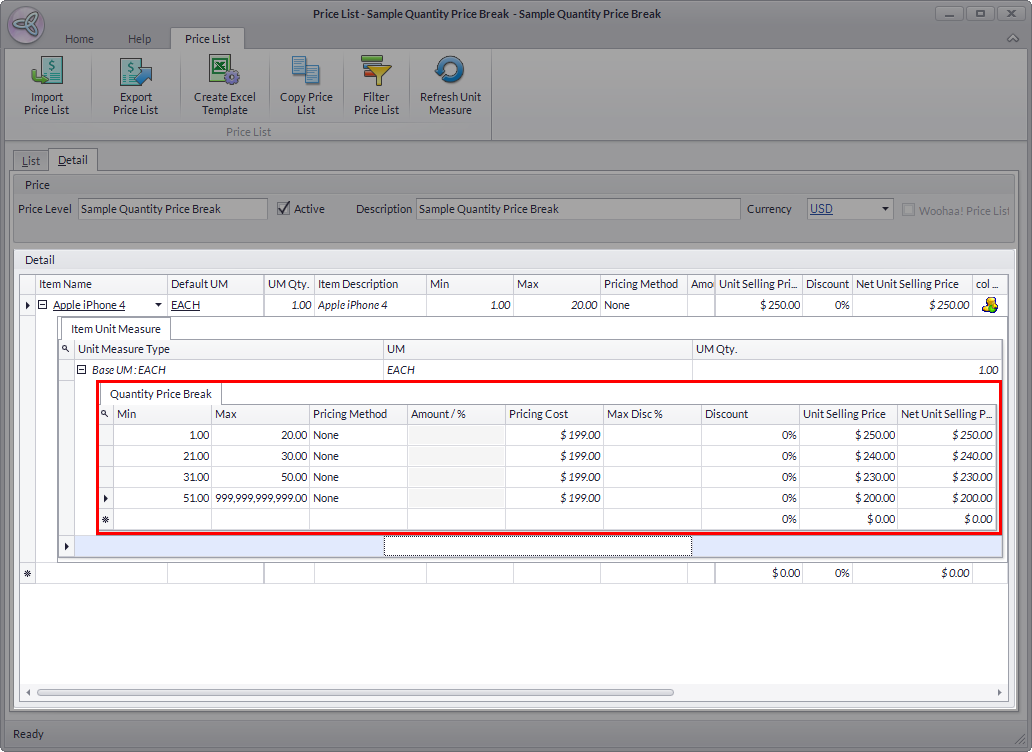 - In the Detail section, select an item, to which you want to assign the quantity price break to. Drilldown the item details and the Base UM to edit the preferred price breaks for different quantity levels.