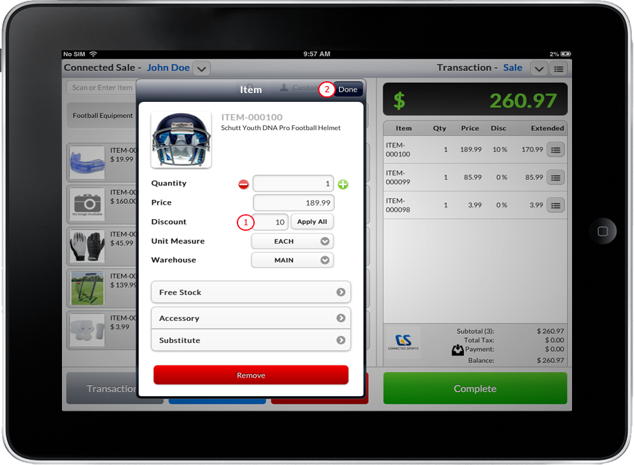 You can apply discount to an item or a transaction(sale) in the Mobile Connected Sale by following the processes dicussed below.