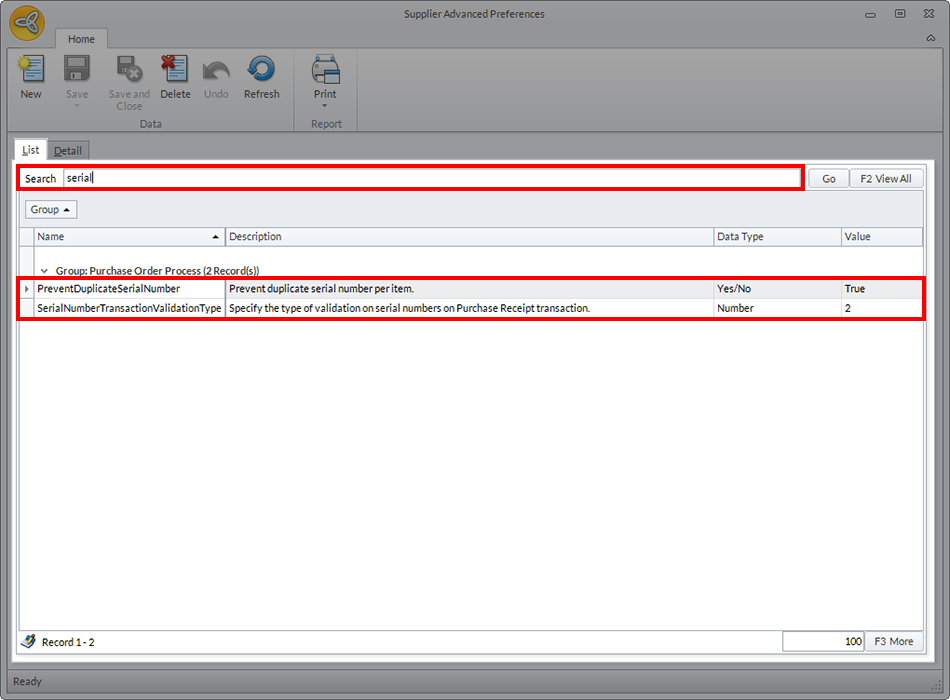 On the search bar located in the List tab, type the word "serial" to view the list of advanced configurations related to serial numbering. The relevant configuration settings for this process are PreventDuplicateSerialNumber and SerialNumberTransactionValidationType.