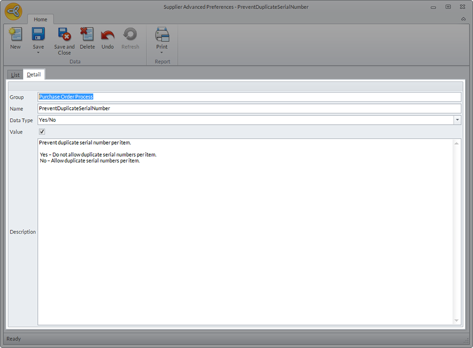 PreventDuplicateSerialNumber ensures that only unique serial numbers are assigned to every item quantity. Check the tick box labeled Value to indicate Yes or No.