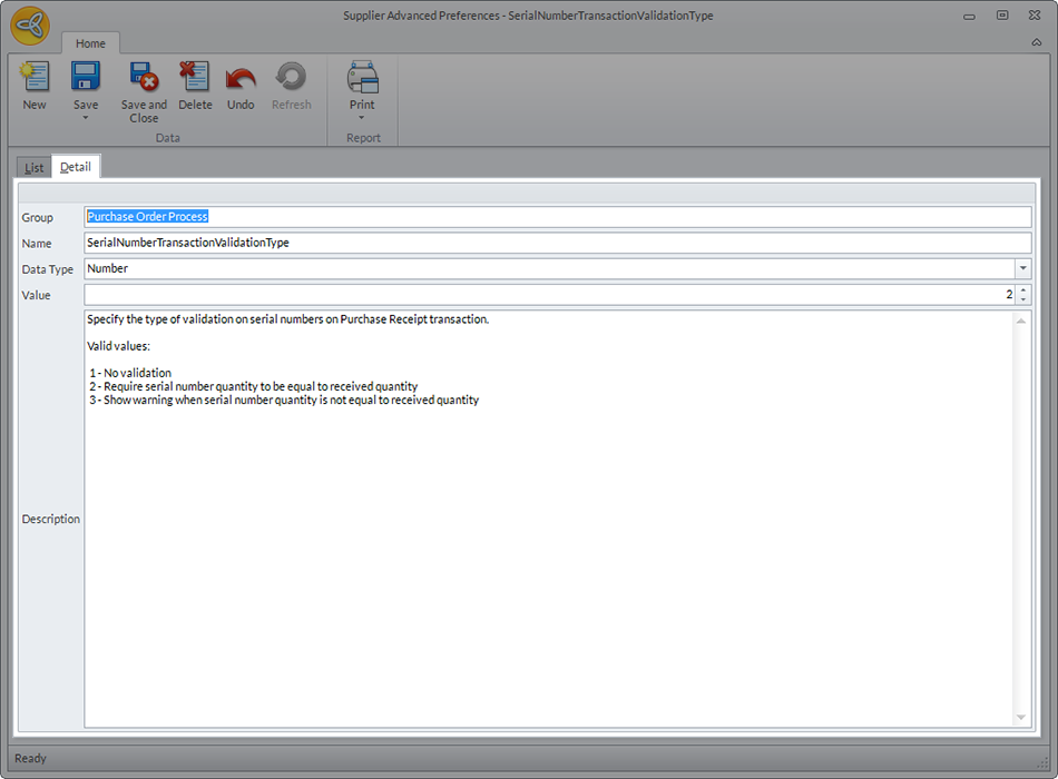 Input the values 1 if you want an order to be processed without further validation, 2 if you want the process to continue only if all the quantities have been serialized or 3 if you want to show a warning that the serialized quantities are not equal to the received quantities.