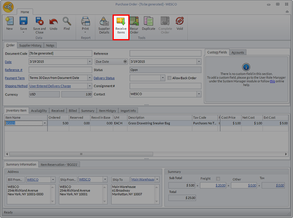 To process serialized items from delivered by suppliers, go to the Supplier module to find the relevant Purchase Order (PO) and click on the Receive Items button.