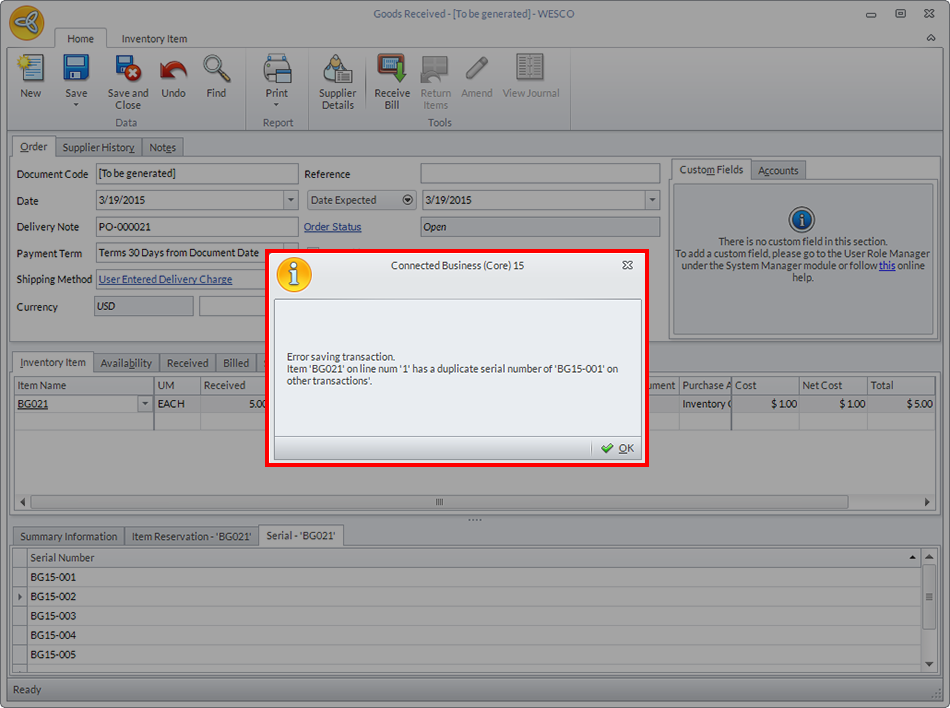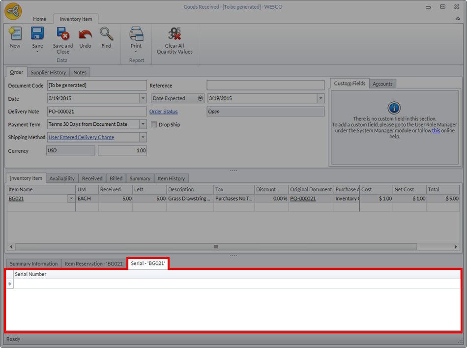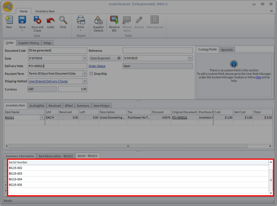 If the item is assigned Serial codes, enter the required number of serial codes based on the quantities received.