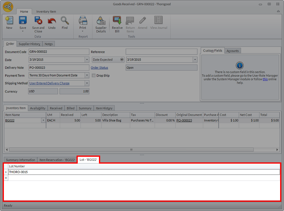 The generated Goods Received form will include a Serial or Lot tab located at the bottom of the form.