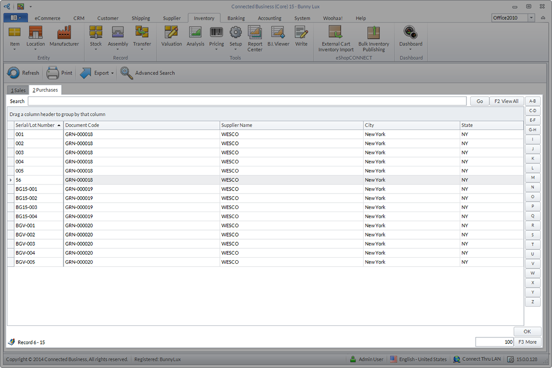 The Purchases tab will contain the list of serial and lot numbers with their association GRN codes.