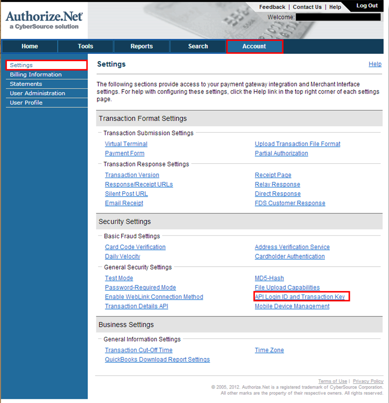 - Upon logging in, go to Account > Settings > Security Settings > General Security Settings and select API Login and Transaction Key.