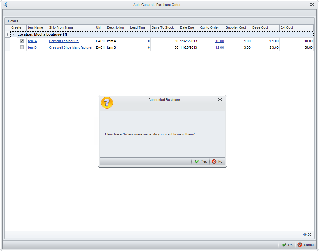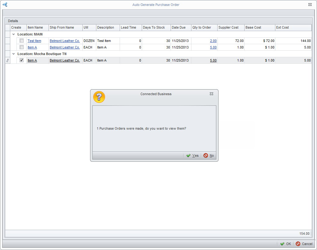 - Select the purchase order to process and click OK. A message prompt will be displayed indicating that a purchase has been created. Click Yes to view the purchase order.