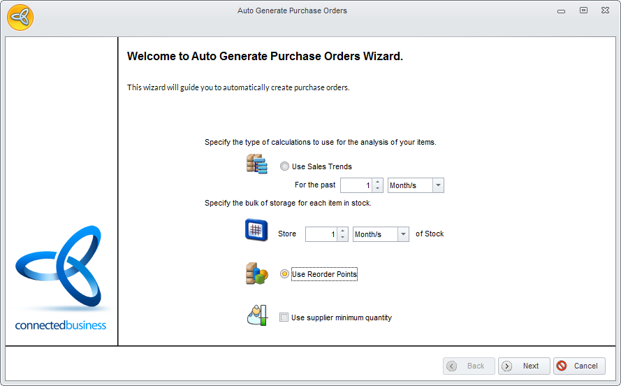 - Tick the Use Reorder Points option and click Next to continue.
