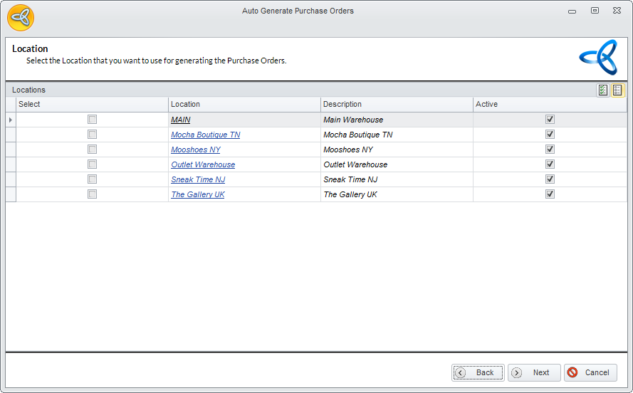 - In the Location page, select the location you want to use for generating the purchase orders. Click Next to continue.