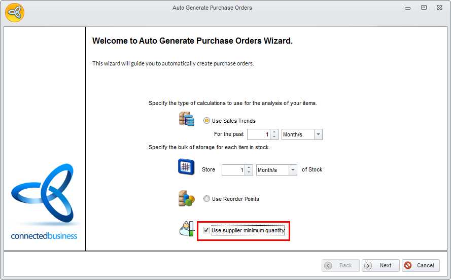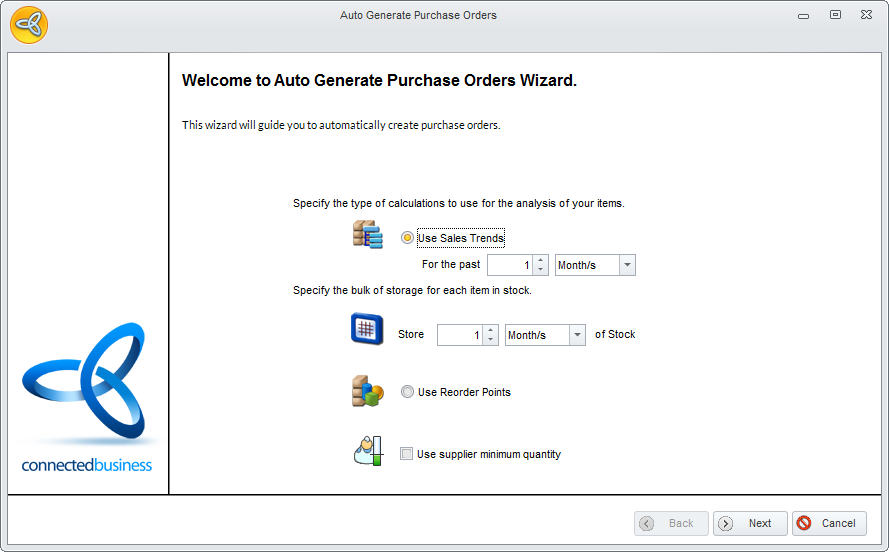 - Tick the Use Sales Trends option and indicate the time span for the sales trend. Click Next to continue.