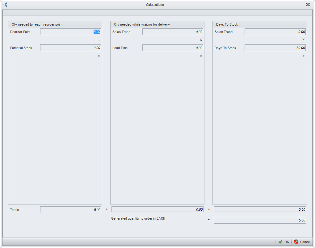 The quantity of items to be ordered is indicated in the Qty to Order column. You can click on the quantity value to view the criteria used in calculating the quantity of items to be ordered.