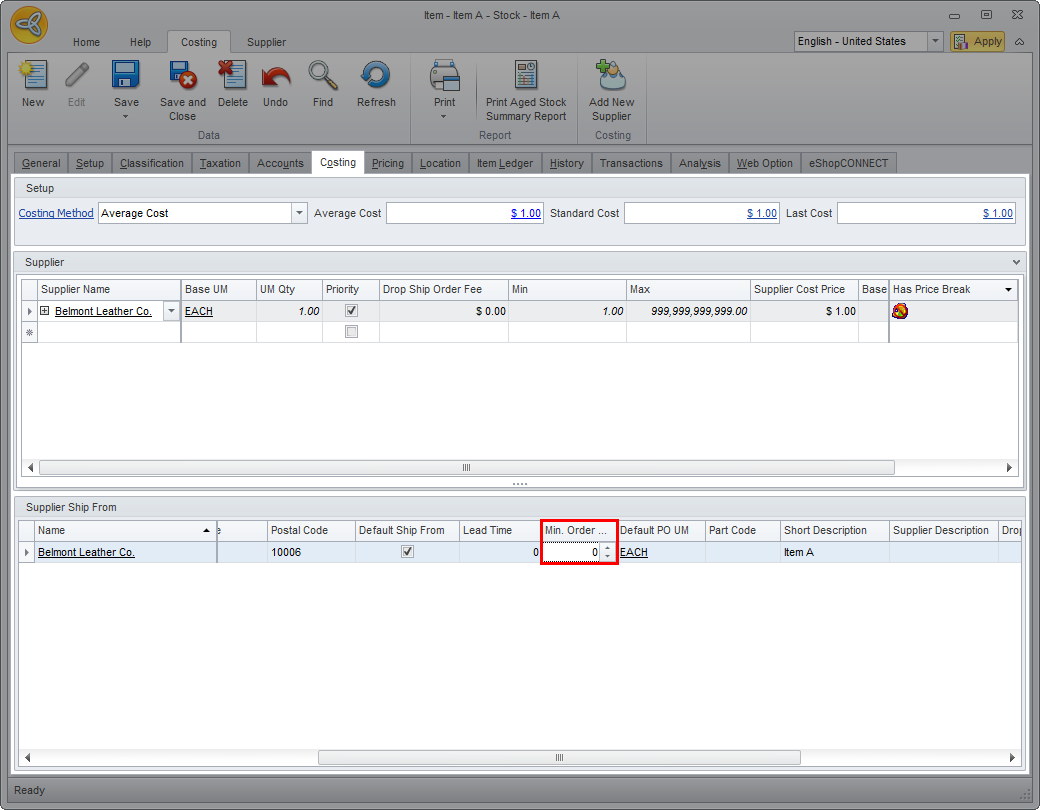 You can check the supplier minimum quantity from the Inventory Item detail form> Costing > Supplier Ship From > Min. Order Qty column. If no minimum order quantity is indicated, you can ask the supplier directly for the information and enter the value.