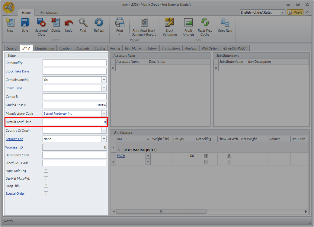 If there is no lead time set up for the item in the Costing tab, the system will get the lead time defined in the Setup tab > Default Lead Time of the Item Detail form..