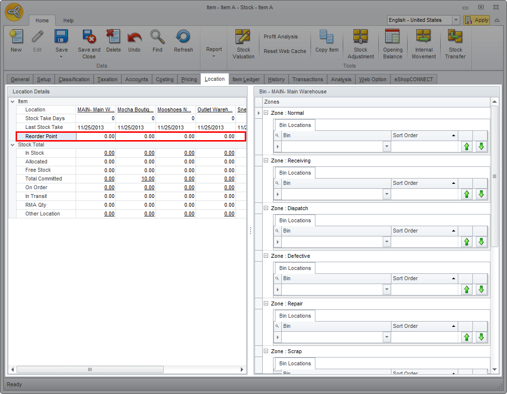 - Go to Location tab > Item and indicate the reorder values for the item in the Reorder Point field of each location.