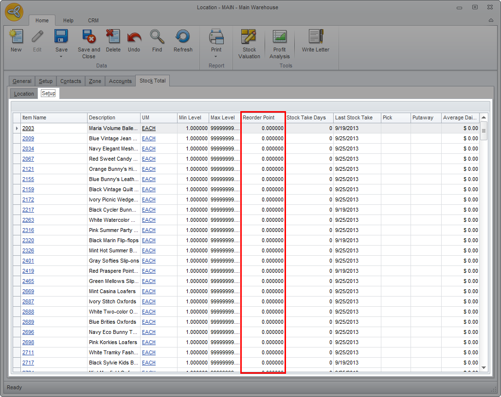 - Go to Stock Total > Setup and enter reorder values in the Reorder column for all items in the warehouse.