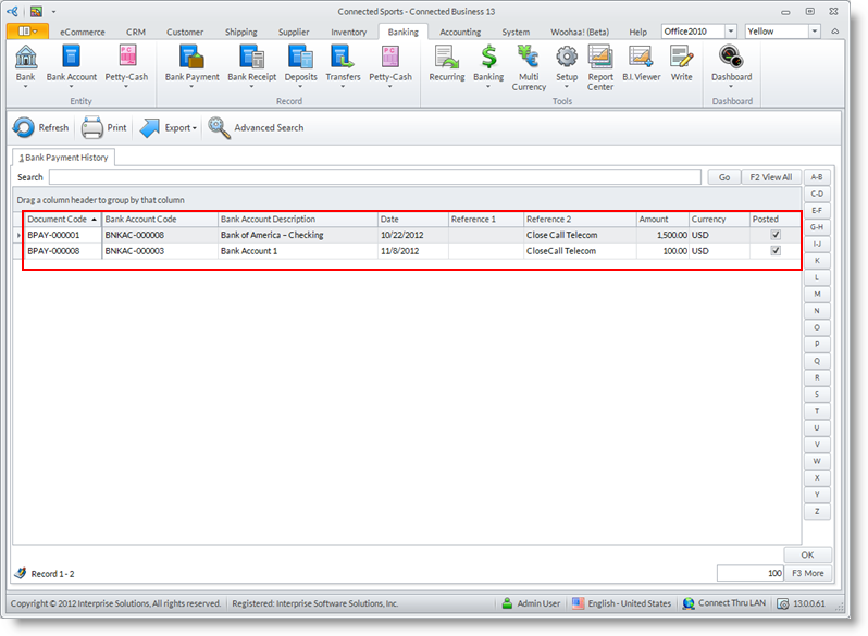 - The Bank Payment History will be displayed with the list of bank payments made.Select the bank payment record you want to review.