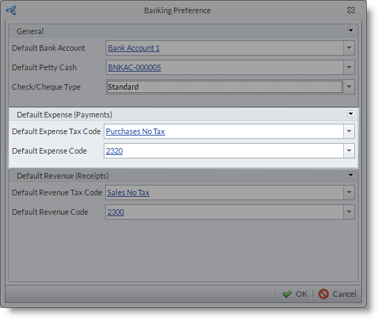 - In the Default Expense Code field, select the preferred default expense account code for bank payments from the dropdown list.