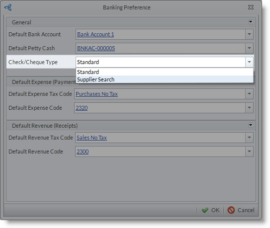 - In the Check / Cheque Type field, select Supplier Search option from the dropdown list.