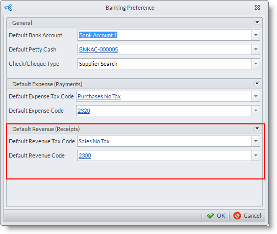 - In the Default Revenue Code field, select the preferred default expense account code for bank receipts from the dropdown list.