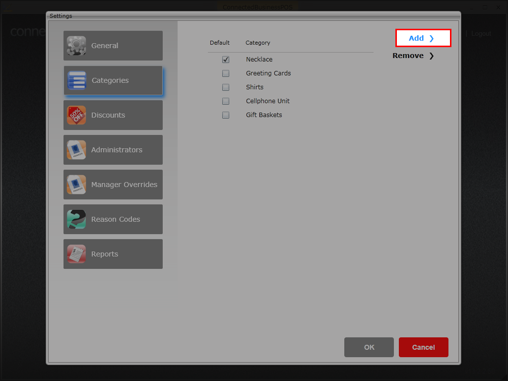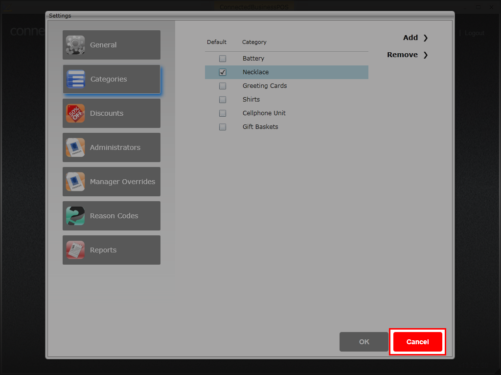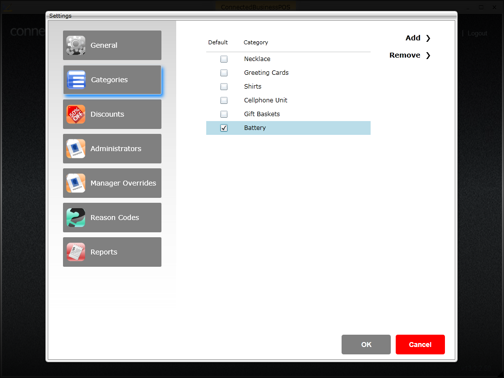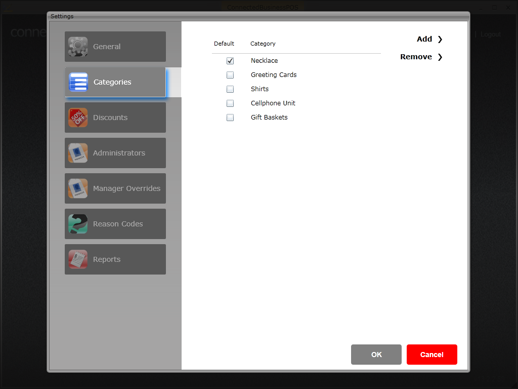 With Connected Business POS, you have the ability to fully customize your item categories to best suit your selling strategies and maximize efficiency. In this section, we will discuss the basics of adding, removing, setting and cancelling changes in your POS categories.
