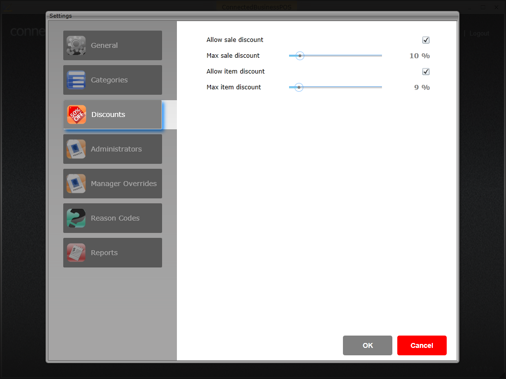 - Specify the maximum amount of sale discount in the Max Sale Discount field or Max Item Discount field for an item by moving the cursor to the left or right side. The maximum sale discount is subtracted from the overall sale transaction by percentage of the amount.