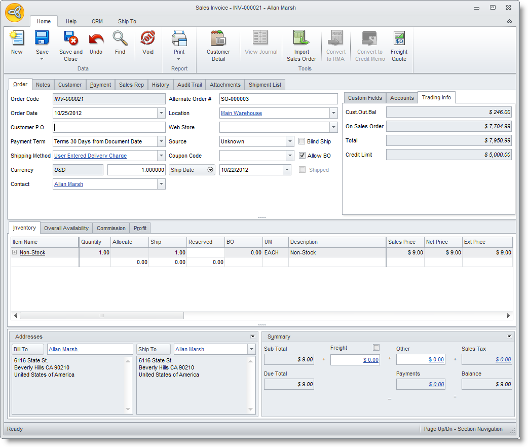- After choosing any one of the options above, the Sales Invoice form will be displayed. The Sales Invoice form will display the default information setup for the customer. You may change this default information for this current invoice. Refer to the table from Creating Sales Invoice from a Previous Sales Order.