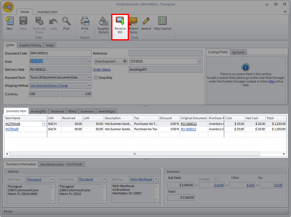 When the rest of the line items have been delivered by the supplier, open the GRN and click on the Receive Bill button again.