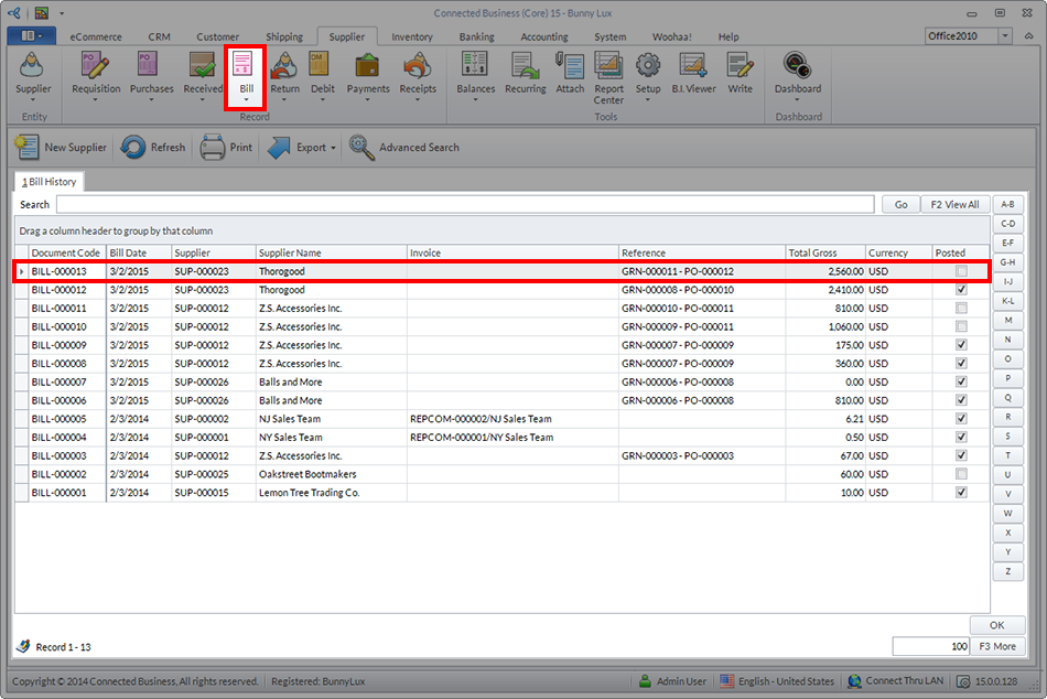 Open the Supplier module, go to Received < Find Goods Received. On the Goods Received form, click the Receive Bill button to generate a new bill.