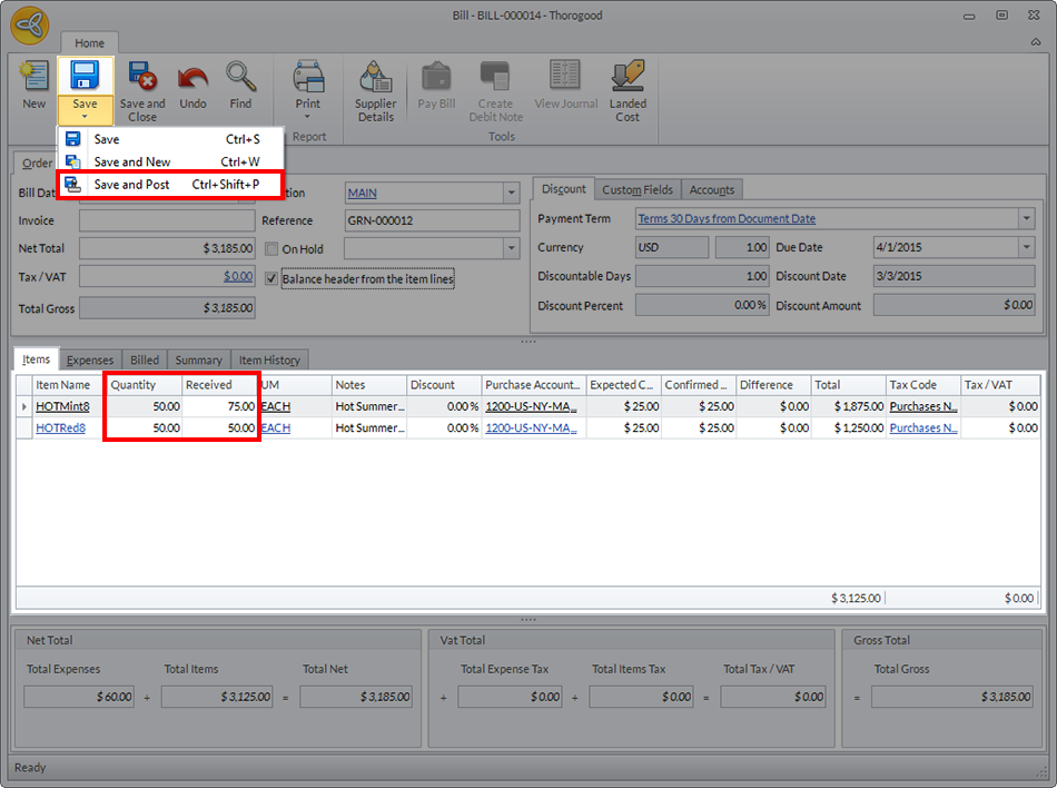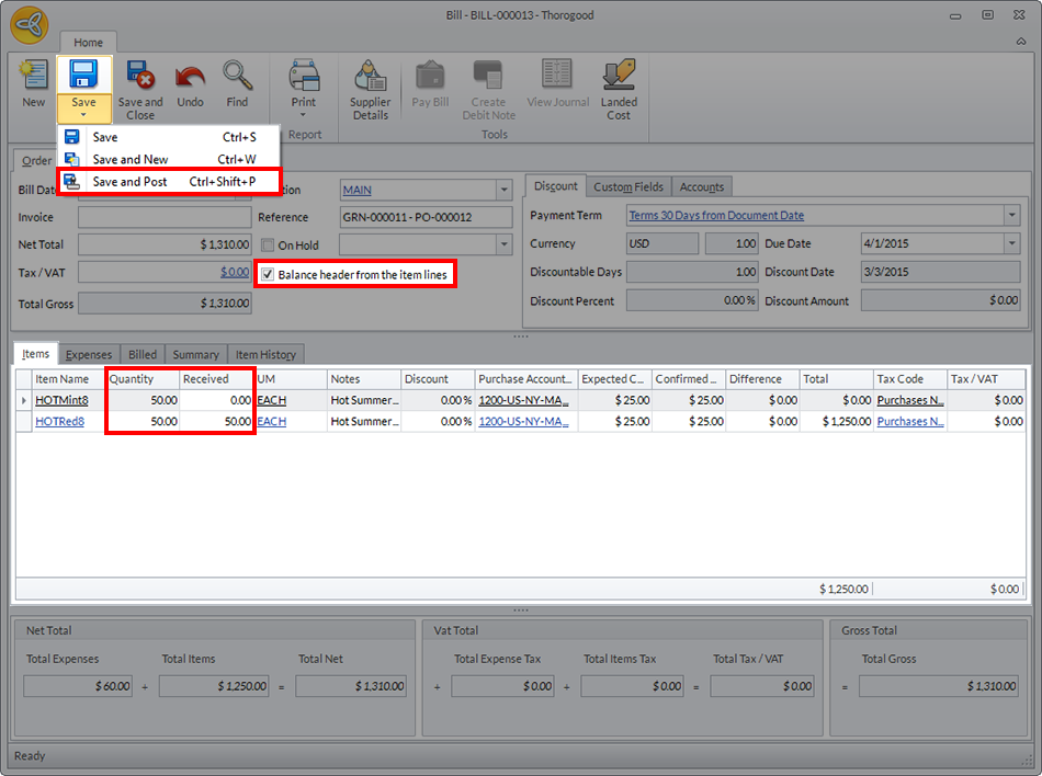 Complete the process by cliking Save and Post. You can then move on to the next transaction such as paying the bill.
