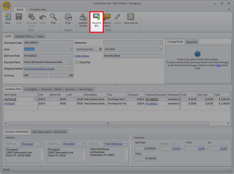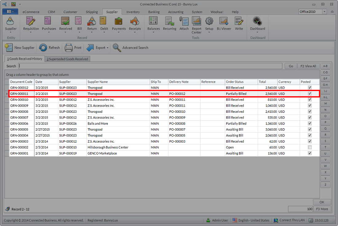 Because at least one of the line items have not been fulfilled, the original GRN remains open. The order status is now labeled as Partially Billed.