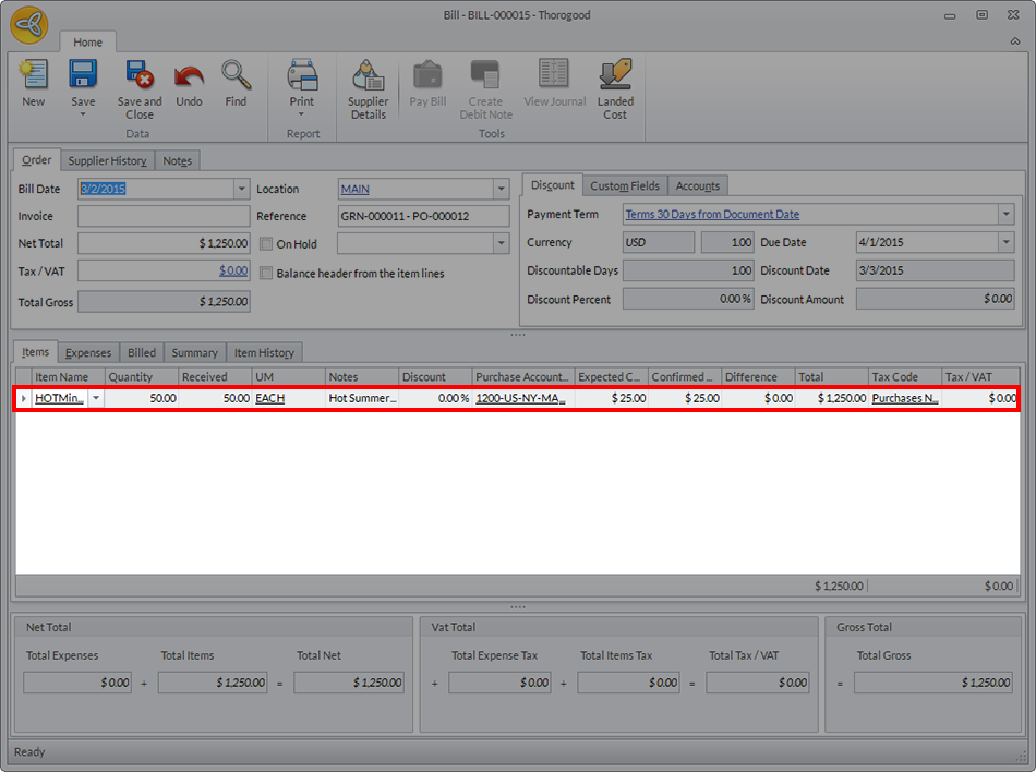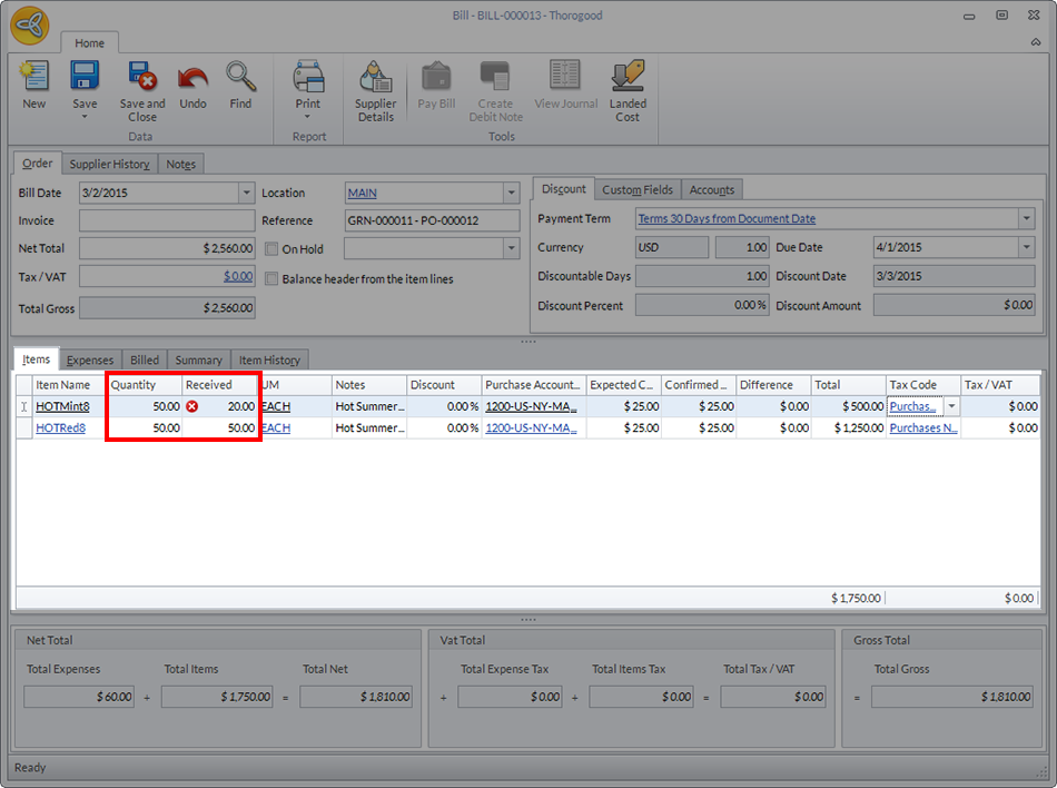 If you want to bill your supplier for a larger quantity of items than is listed from the GRN, you can type the number under the Received column of the line item.