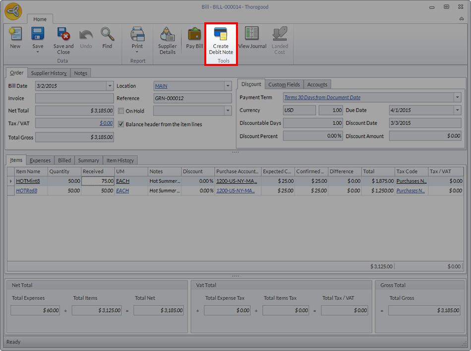 If you click Create the Debit Note, a new debit memo associated with this transaction will be generated. You can access this new document by going to Supplier > Debit > Find Debit Note.