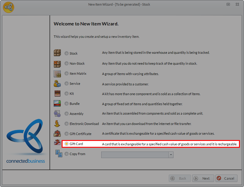 The Gift Card is a prepaid, rechargeable card that is exchangeable for a specified cash value of goods and/or services. Considered as a non-stock item, it is one of the latest additions in the list of items that can be set up in Connected Business.