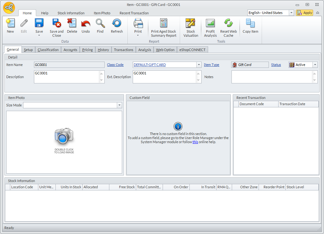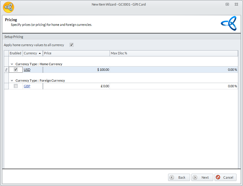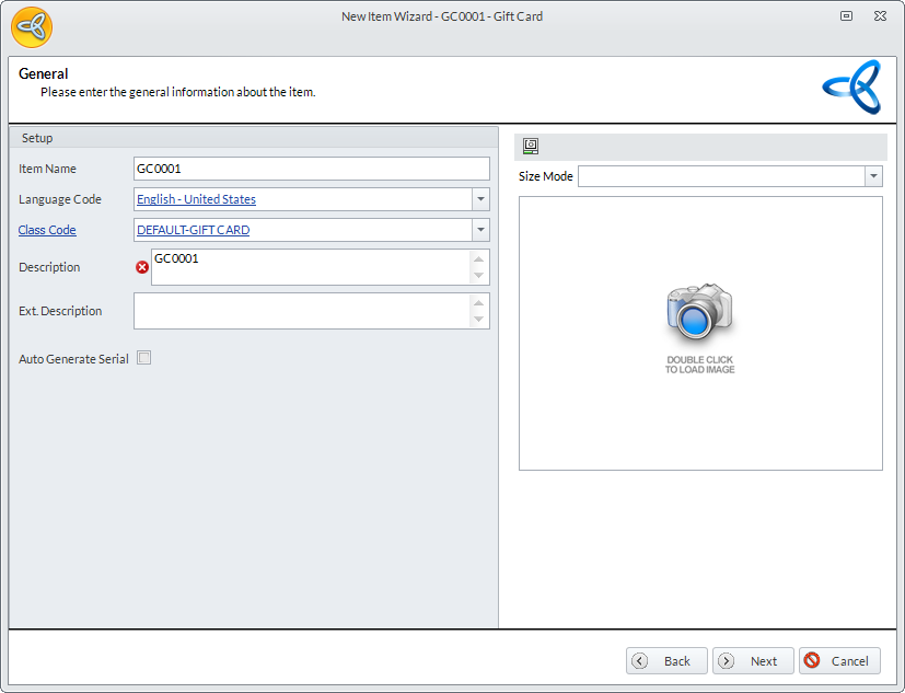 - Click Next and Finish to close the New Item Wizard. The Gift Card Item Detail form will be displayed. From here, you can edit the gift card details as necessary.