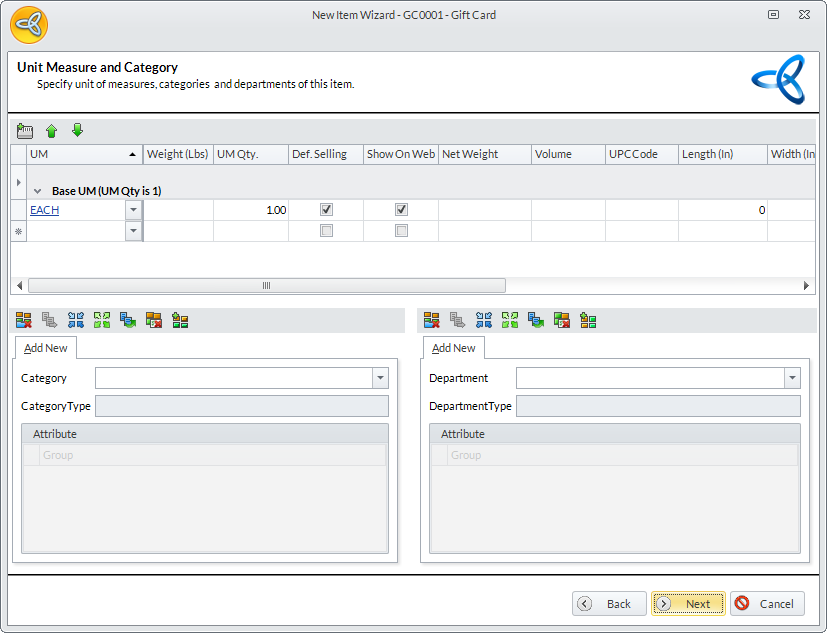- In the Unit Measure and Category page, assign the unit measure and category/department (if applicable) for the gift card. Click Next to proceed.