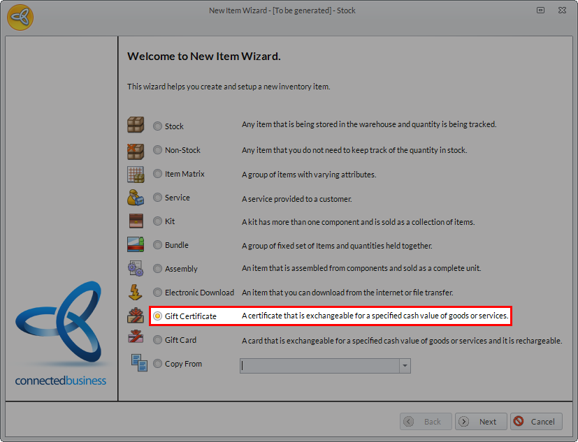 The Gift Certificate is a prepaid voucher that is exchangeable for a specified cash value of goods and/or services. Considered as non-stock item, it is one of the latest additions in the list of items that can be set up in Connected Business.