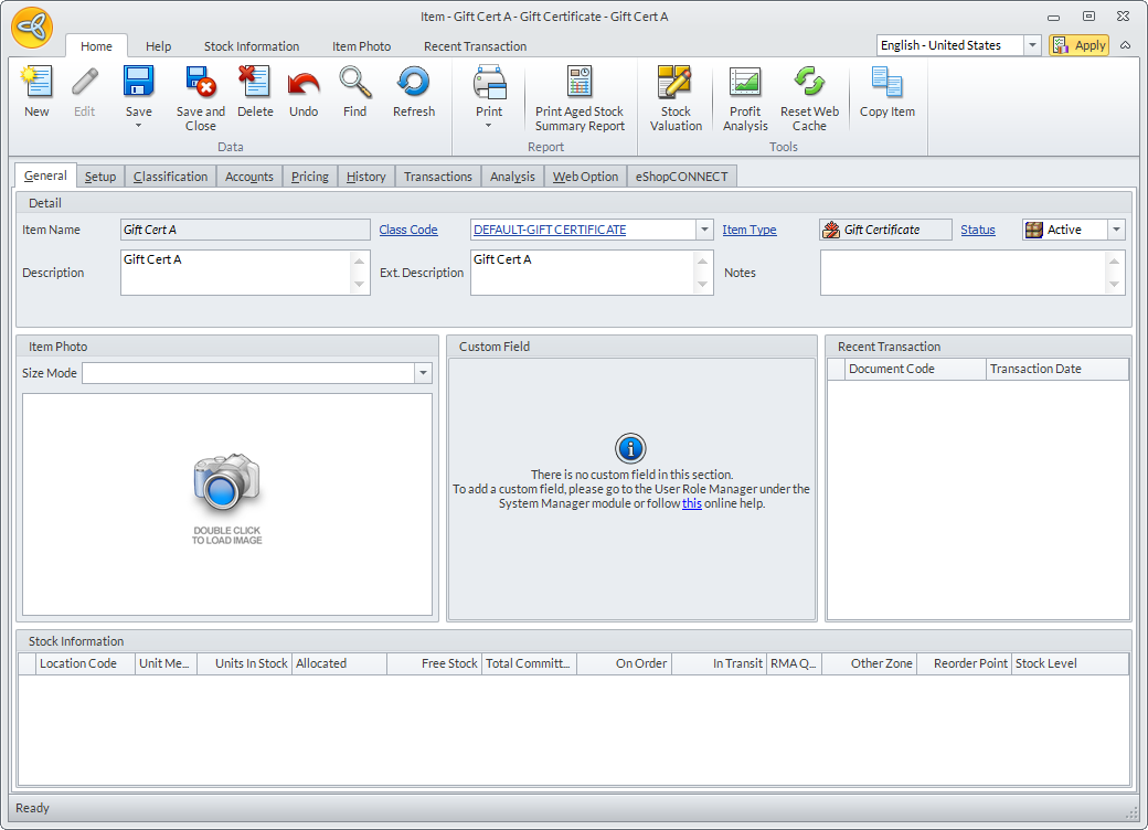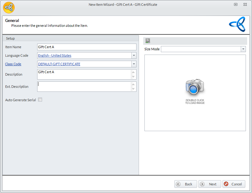 - Click Next and Finish to close the New Item Wizard. The Gift Certificate Item Detail form will be displayed. From here, you can edit the gift certificate details as necessary.
