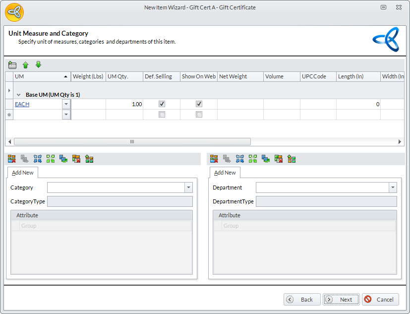 - In the Unit Measure and Category page, assign the unit measure and category/department (if applicable) for the gift certificate. Click Next to proceed.