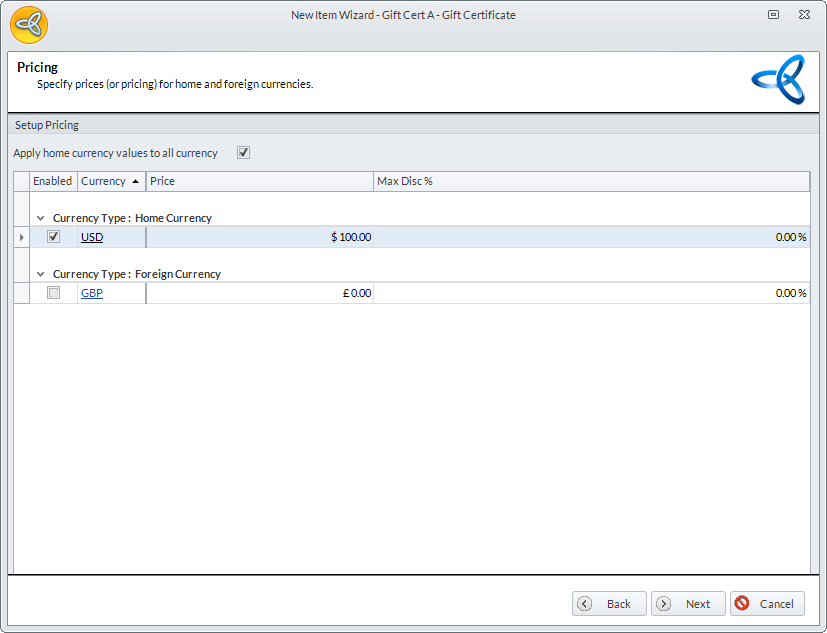 - In the Pricing page, set the pricing or equivalent price value of the gift certificate. In the Enabled column, tick the checkbox of the currency you want to use for the gift certificate.