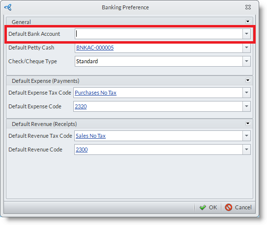 - In the Default Bank Account field, select from the dropdown list the default bank account to use in bank transactions (bank payments, bank receipts).