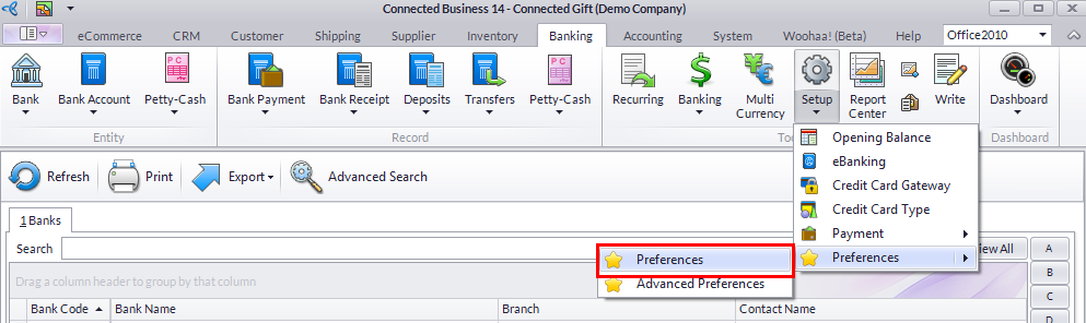 - Go to Banking > Setup and select the Preferences option. The Banking Preference form will be displayed.