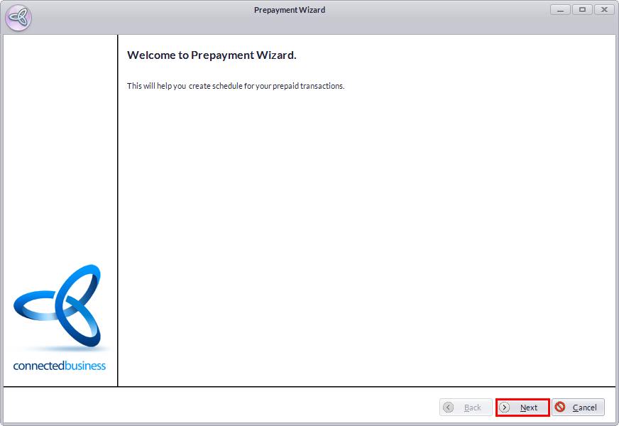 - From the Accounting module, select Prepayment > New Prepayment button from the menu options. The Prepayment Wizard will display.