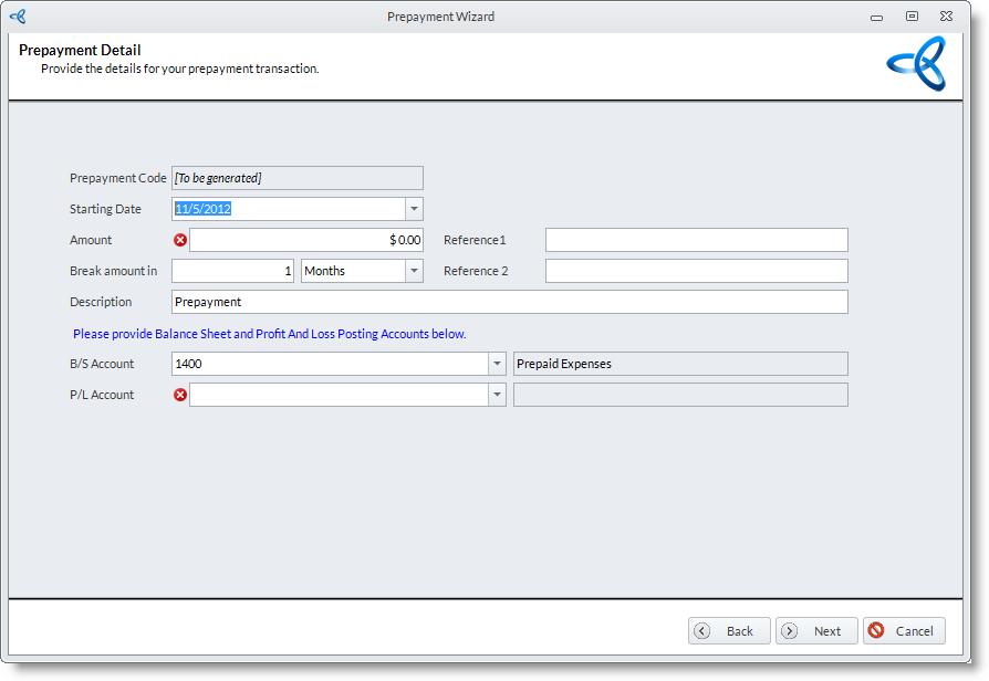 The Prepayment Wizard is designed for the journal needs of the non-account type user. In creating a prepayment schedule, you must carefully identify the items you would enter as prepayment. It is good to inquire people who might know of any unearned revenue.