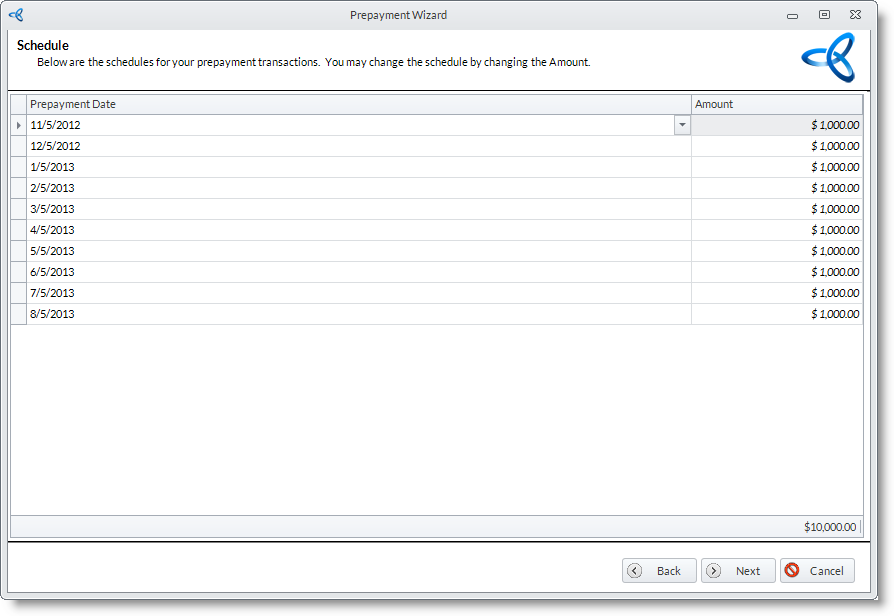 The schedule for the prepayment transaction and their corresponding amounts will appear. You may change the dates and the amounts as needed. Click Next to continue.