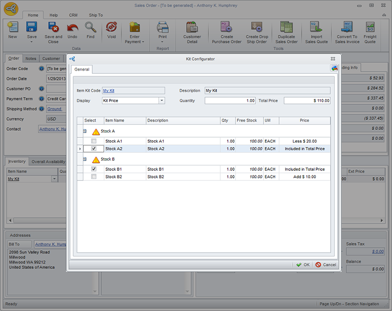 Upon creating a sales order or invoice for kit items, the kit configurator will pop up showing the kit components. Select the components for the kit item and the system will calculate the freight charge based on the weight of the components selected.