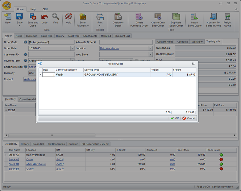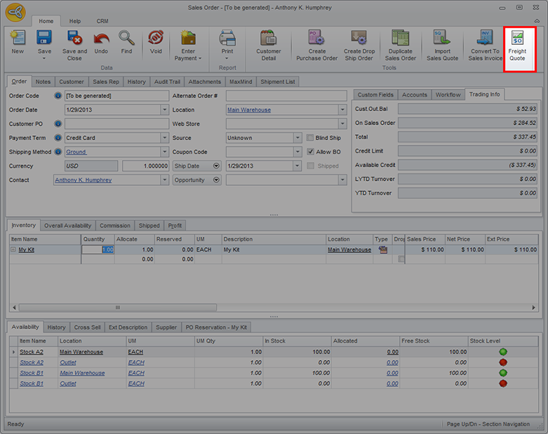 To get the freight charge, just click on the Freight Quote button in the sales order or invoice form.